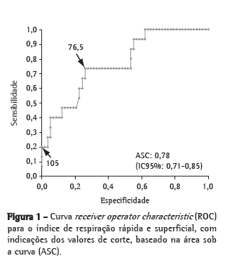 Dos 15 pacientes que necessitaram de reintubação, apenas 3 apresentaram valor de IRRS > 105 ciclos/min/L, e 12 apresentaram IRRS ≤ 105 ciclos/min/L (preditivo de sucesso).(16) Entre os 58 pacientes extubados com sucesso, 55 apresentaram IRRS ≤ 105 ciclos/min/L, e 3 tiveram IRRS > 105 ciclos/min/L. A soma da sensibilidade e da especificidade para esse valor de corte foi de 115.
