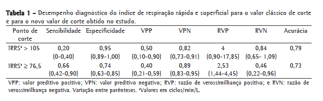 Com o novo valor de corte, dos 15 pacientes reintubados, 10 apresentaram IRRS valor ≥ 76,5 ciclos/min/L (preditivo de reintubação). Dos 58 pacientes extubados com sucesso, 43 apresentaram IRRS < 76,5 ciclos/min/L e 15 com IRRS ≥ 76,5 ciclos/min/L. A sensibilidade sofreu um aumento substancial, de 20% para 66%, com o novo valor de corte. Os valores preditivos (positivo e negativo) para o valor de corte clássico foram 50% e 82%, respectivamente; para o novo valor de corte, esses foram 40% e 89%, respectivamente. Já os valores de razão de verossimilhança (positiva e negativa) obtidos para o valor de corte clássico foram 4 e 0,84, respectivamente; para o novo valor de corte, esses foram 2,53 e 0,46, respectivamente. Os valores do teste diagnóstico para o IRRS com o novo valor de corte e com o valor de corte da literatura estão apresentados na Tabela 1.