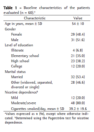 We evaluated 60 patients enrolled in the smoking cessation program of a tertiary-referral cardiothoracic hospital in the city of Fortaleza, Brazil. The study period was from August of 2006 to August of 2007.