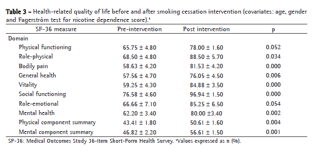 Analysis of covariance of HRQoL from baseline to the end of the program, taking age, gender and FTND score as covariates, revealed that the quitters presented statistically significant improvement in the role-physical, bodily pain, general health, vitality, social functioning and mental health domains, as well as in the physical component summary and the mental component summary (p < 0.05 for all; Table 3).