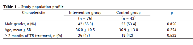 Patients in the intervention and control groups were similar in terms of gender, age and the duration of TB treatment prior to sputum sample collection (Table 1). In the intervention group, 100% of the sputum samples were classified as adequate in volume (≥ 5 mL), compared with only 23% of the control group samples (Table 2). In terms of the aspect of the sputum samples, 100% and 83% of the intervention and control group samples, respectively, were classified as mucopurulent (p < 0.05). The TB positivity rate, as determined by direct sputum smear microscopy to detect acid-fast bacilli, was similar in the intervention and control groups: 4% and 7%, respectively (p = 0.47). Culture contamination was identified in 10 (13%) of the 76 intervention group samples, compared with 16 (37%) of the 43 control group samples (p = 0.002; OR = 0.25; 95% CI: 0.09-0.69).
