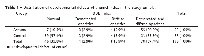 Our findings are in agreement with those of another group of authors,(11) who observed a positive correlation between respiratory disorders, such as asthma, and the presence of demarcated opacities in first permanent molars. Other authors have also suggested that asthma is associated with the occurrence of DDEs in permanent teeth.(19,20)