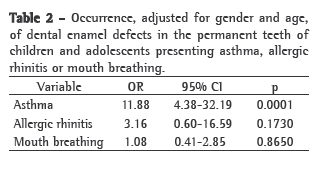 Logistic regression was used in order to assess the risk of dental enamel defects in a multivariate analysis. The model included the variables asthma, allergic rhinitis and mouth breathing, all adjusted for age and gender.