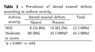 The phi coefficient was used in order to determine whether the prevalence of dental enamel defects correlated with asthma severity, symptom onset, timing of the initiation of treatment and frequency of medication use. In order to perform this analysis, those variables were considered dichotomous: asthma severity (mild or moderate/severe); symptoms onset (before or after 3 years of age); initiation of treatment (before or after 3 years of age); and frequency of medication use (continuous and for acute attacks only).