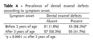 Despite the fact that some studies have identified asthma as a potential etiological factor in the occurrence of dental enamel defects,(11) there have been no studies investigating the possible interactions between such occurrence and the onset of asthma symptoms or the timing of treatment.