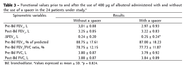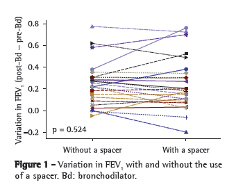 Those studies are warranted primarily by the widespread use of inhaled drugs via an MDI in the treatment of numerous respiratory diseases. We searched the Medline, SciELO, and LILACS databases using the specific descriptors "asthma", "spirometry", and "inhalation spacers", as well as their counterparts in Portuguese, as search terms. We also used the Boolean operator "AND". As of January of 2011, we had found no studies comparing the bronchodilator test results obtained with the use of an MDI with a spacer and those obtained with the use of an MDI without a spacer. Therefore, it is impossible to compare the results of the present study with data in the literature. This is why we attempted to correlate the results of the present study with known data regarding the use of MDIs with and without spacers in the treatment of obstructive lung disease.