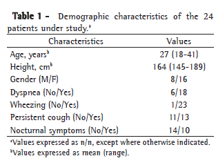 The tests were performed between August 31, 2007 and August 5, 2009 in the Pulmonary Function Laboratory of the HC-UFMG Department of Pulmonology. We selected 25 patients. One patient did not return for the second test and was therefore excluded. The mean age was 27 years (range, 18-41 years). Of the 24 patients, 16 (67%) were female and 8 (33%) were male (Table 1).