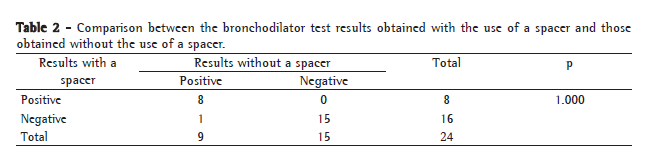 Regarding the bronchodilator test results (positive or negative), there were no statistically significant differences between the usual technique and the technique with a spacer (p = 1.00).