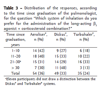 The inhaler is important for the effectiveness of the inhaled medication. A number of studies have demonstrated that the choice of the inhalation system should consider characteristics of the user, of the solution to be inhaled and the appropriate site for the deposition of the drug. In Brazil, there are three models of inhalers designed to deliver the long-acting β2 agonist + inhaled corticosteroid combination: Aeroliser® (capsules for inhalation); Diskus®; and Turbuhaler®. Two thirds of the interviewees reported a preference for a determined inhaler. Table 3 shows the preferences according to time since graduation. We found a discrete preference for Aeroliser® and Diskus® systems regardless of the time in practice.
