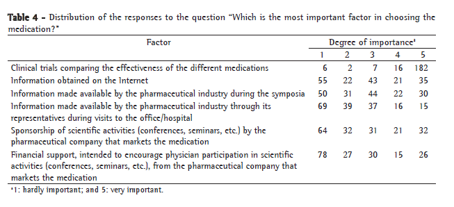 Finally, we tried to identify the most important factor in the selection of the medication to be prescribed. Several options were given, involving different modalities of scientific information and support given by pharmaceutical industries to medical activities. We asked the pulmonologist to establish a value for each of the options, ranging from 1 (least important) to 5 (most important). In Table 4, we showed the degrees of importance given to each of the factors listed.