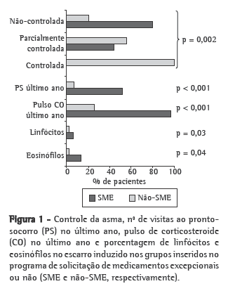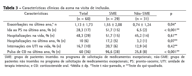 Os critérios de inclusão de pacientes no programa do SME, determinados pela Portaria Complementar SAS/MS nº 12, de 12 de novembro de 2002,(4,10) foram adequados para identificar o grupo de pacientes mais graves. Eles estratificaram aqueles pacientes que utilizaram os recursos de saúde mais frequentemente. Pacientes selecionados para receber medicações pelo programa SME apresentaram um maior número de visitas ao pronto-socorro no último ano, maior número de exacerbações e também precisaram fazer uso de pulsos de corticosteroide mais frequentemente. Sabemos que pacientes com asma grave que atingem o controle da doença têm um menor número de visitas a serviços de emergência e menores chances de usar pulsos de corticosteroide oral, embora esses marcadores de gravidade não tenham significante associação com a corticodependência.(17)