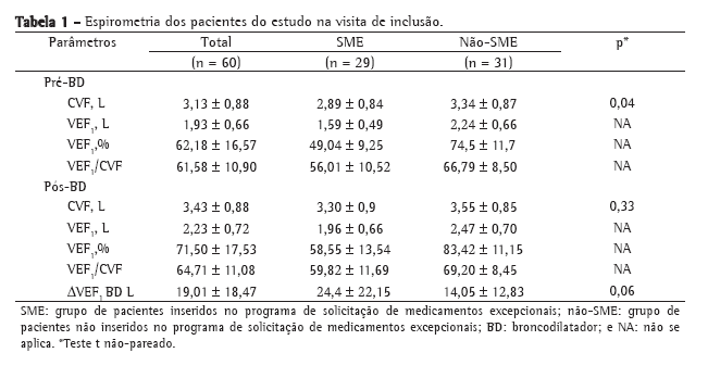 Sessenta pacientes foram incluídos no estudo. O grupo de pacientes que recebeu medicação gratuita (grupo SME) apresentou menores valores de CVF pré-broncodilatador, e essa diferença foi estatisticamente significante. A variável VEF1 não foi avaliada estatisticamente, pois fazia parte dos critérios de inclusão do estudo. Em relação a ΔVEF1 após o uso de broncodilatador, os dois grupos estudados mostraram-se homogêneos (Tabela 1).