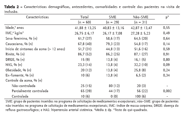 Os critérios de inclusão foram os seguintes: ter idade entre 16 e 80 anos, ter diagnóstico de asma segundo os critérios do Global Initiative for Asthma (GINA) de 2004,(11) concordar em participar da pesquisa; realizar espirometria com teste com broncodilatador na visita de inclusão; e comprovar o comparecimento a pelo menos três visitas no ano que precedeu a data da inclusão.