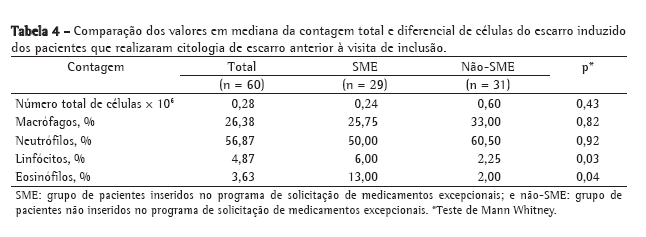 O grupo SME apresentou um aumento significante de linfócitos e eosinófilos na citologia do escarro induzido, colhida antes da visita de inclusão, em relação ao grupo não-SME (Tabela 4 e Figura 1).