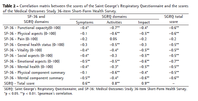 The correlations between the respective questionnaires are shown in Table 2. With the exception of the pain domain, all of the SF-36 domains correlated with the SGRQ total score (−0.5 ≤ r ≤ −0.7; p < 0.01). The strongest correlations between the SF-36 and the SGRQ domains, respectively, were as follows: functional capacity and activities (r = −0.7; p < 0.01); physical aspects and activities (r = −0.6; p < 0.01); and emotional aspects and impact (r = −0.6; p < 0.01).