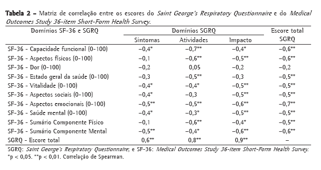 As correlações entre os respectivos questionários estão demonstradas na Tabela 2. Todos os domínios do SF-36 apresentaram correlação com o escore total do SGRQ (−0,5 ≤ r ≤ −0,7; p < 0,01), exceto o domínio dor. As maiores correlações entre os domínios do SF-36 e do SGRQ foram entre os domínios capacidade funcional e atividade (r = −0,7; p < 0,01), aspectos físicos e atividades (r = −0,6; p < 0,01) e aspectos emocionais e impacto (r = −0,6; p < 0,01).