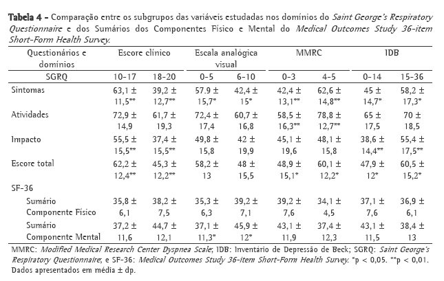 Considerando-se o percentil 50, as variáveis estudadas foram divididas nos seguintes subgrupos: escore clínico (grupo 1: escore 10-17; grupo 2: escore 18-20); EVA (grupo 1: escore 0-5; grupo 2: escore 6-10); dispneia pelo escore MMRC (grupo 1: 0-3; grupo 2: 4-5); escore do IDB (grupo 1: 0-14; grupo 2: 15-36). O domínio sintomas do SGRQ foi o único que apresentou diferenças estatisticamente significativas em todos os subgrupos das seguintes variáveis: escore clínico, escore de dispneia, EVA e IDB. No domínio atividades, a única diferença significativa foi quanto a variável escore de dispneia (20,3 pontos). No domínio impacto, houve diferenças significativas nas variáveis escore clínico (18,1 pontos) e IDB (16,8 pontos). No SF-36, houve diferença estatisticamente significativa do escore do MCS nos subgrupos da variável EVA (diferença de 8,8 pontos). No escore total do SGRQ, a única variável em que não houve diferença entre os subgrupos foi justamente na EVA. (Tabela 4)