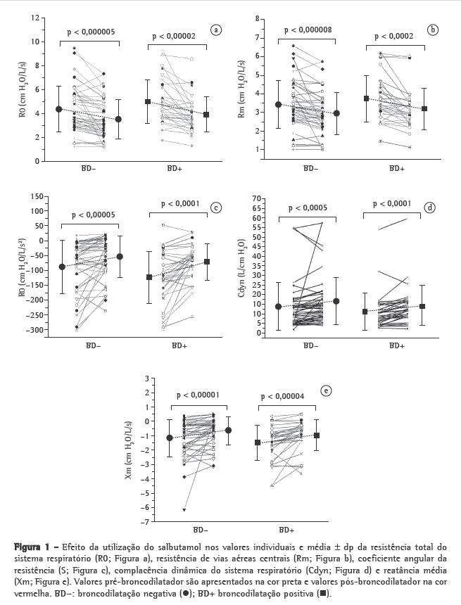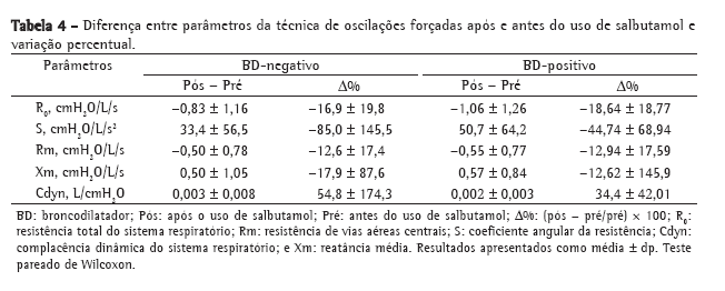 O sistema utilizado para as análises da TOF aplica sinais senoidais de pressão com frequências múltiplas inteiras de 2 Hz na faixa compreendida entre 4 e 32 Hz. A medição da pressão aplicada e do fluxo resultante permite estimar a impedância respiratória por meio da análise de Fourier.(16,17,22) Para a avaliação da resposta broncodilatadora pela TOF, foram utilizados os parâmetros provenientes das curvas de resistência e reatância do sistema respiratório. Através da regressão linear da curva de resistência, efetuada na faixa de frequência de 4 a 16 Hz, foi obtida a resistência no intercepto (R0) e o coeficiente angular da resistência (S), além da resistência média compreendida entre 4 a 16 Hz (Rm). A R0 está associada à resistência total, S se relaciona com a homogeneidade do sistema respiratório, enquanto Rm está associada à resistência de vias aéreas centrais.(16,17,22) Através da reatância obtida em 4 Hz, foi calculada a dynamic compliance (Cdyn, complacência dinâmica) do sistema respiratório (Cdyn = −1/2ω × f × Xrs, 4Hz), sendo também obtida a reatância média (Xm), que está associada à homogeneidade do sistema respiratório.