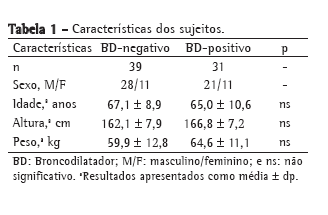MétodosForam avaliados indivíduos provenientes do ambulatório de DPOC do Hospital Universitário Pedro Ernesto (HUPE), na cidade do Rio de Janeiro. Os pacientes foram avaliados consecutivamente e classificados em dois grupos, de acordo com o teste de resposta broncodilatadora. O primeiro grupo foi composto por indivíduos com resposta broncodilatadora, identificada com base na presença de variação do VEF1 de 12% e 200 mL e/ou da CVF de 350 mL, previstos após o uso de 300 µg de salbutamol inalatório.(21) Este grupo foi denominado "BD-positivo". O segundo grupo incluiu indivíduos sem resposta broncodilatadora, conforme os critérios da Sociedade Brasileira de Pneumologia e Tisiologia,(21) e foi denominado "BD-negativo". Foi solicitado aos pacientes que se abstivessem do uso de broncodilatadores de ação curta por 6 h e de broncodilatadores de ação longa por 12 h. Os pacientes avaliados se encontravam em condições clínicas estáveis. Foram excluídos do estudo pacientes com asma, sinusite e rinite, ou que tiveram TB, pneumonia e infecções respiratórias nas 3 semanas anteriores à realização do teste, assim como aqueles que não realizassem adequadamente os testes de espirometria ou a TOF. A exclusão do diagnóstico de asma foi feita por meio da análise da história clinica dos pacientes. O presente estudo foi aprovado pelo Comitê de Ética do HUPE e seguiu as especificações da Declaração de Helsinki. Todos os indivíduos realizaram as provas de função pulmonar após a assinatura de um formulário de consentimento esclarecido.