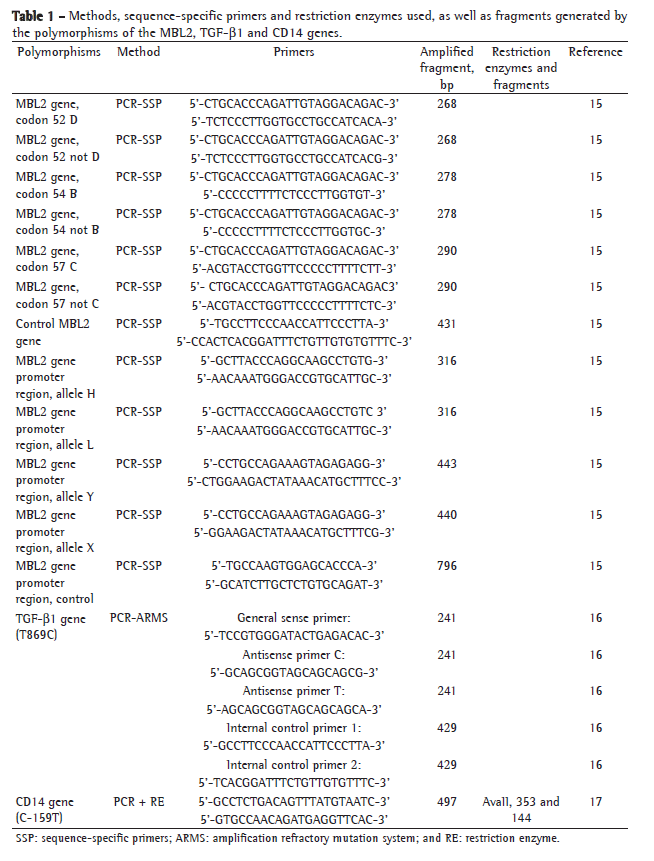 The methods, primer sequences and restriction enzymes used, as well as the size of the fragments generated by MBL2, TGF-β1 and CD14 gene polymorphisms, are described in Table 1.(15-17)