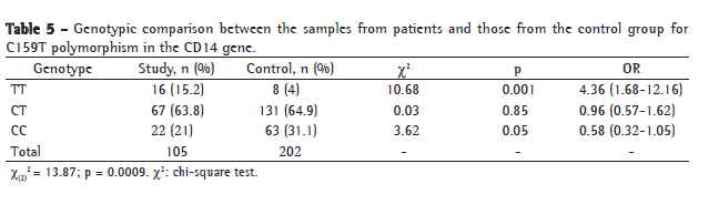 In the genotypic comparison, there was a significant difference between the group of CF patients and the control group regarding C159T polymorphism in the CD14 gene. The TT genotype was found to be a risk factor in the sample, but not a modulating factor of lung disease severity (p = 0.001; OR = 4.36; variation, 1.68‑12.16; Table 5).