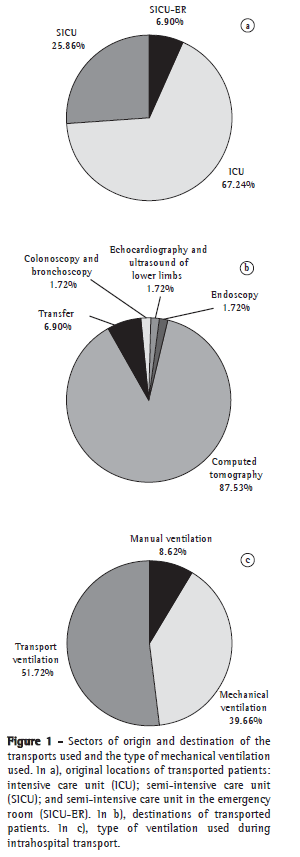 All units involved in this study presented a similar pattern of transport, and the patients were submitted to intrahospital transport according to the routine of the sector. The type of ventilation used was decided by the team itself, according to the clinical status of the patient and the availability of the equipment in the sector.