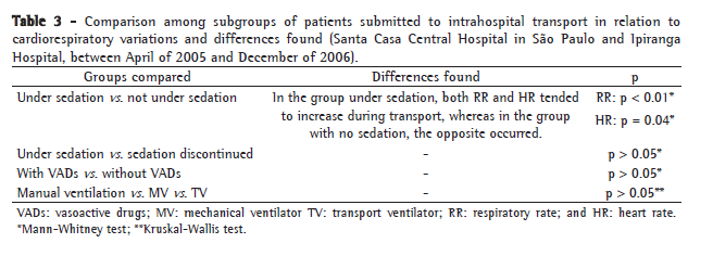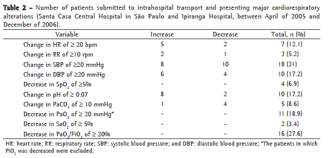 In another study,(18) intrahospital transport was described as a high-risk procedure associated with possible complications, since, in 33% of the 64 transports evaluated, the patients presented major alterations, evolving to cardiorespiratory arrest in 2 cases. The authors of that study discussed the need for standardizing the transport and the precautions taken during this procedure.