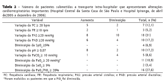 Dos pacientes transportados, 39 (67,2%) apresentaram pelo menos um episódio de alteração cardiorrespiratória relevante. A descrição detalhada encontra-se na Tabela 2.