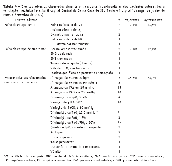 Concluímos que, durante o transporte intra-hospitalar de pacientes submetidos à ventilação invasiva, ocorrem alterações cardiorrespiratórias com grande frequência. Eventos adversos estiveram presentes em 75,7% dos transportes realizados.