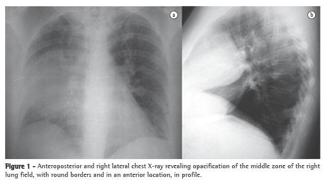 In view of the clinical profile, we considered the following working diagnoses: community-acquired pneumonia, namely bacterial (not excluding that caused by a specific germ), due to the fever and the alterations found during the physical examination; and neoplastic disease, namely lymphoma or lung neoplasia, due to the systemic component of the clinical evaluation associated with the presence of a mass in the chest during the physical examination.