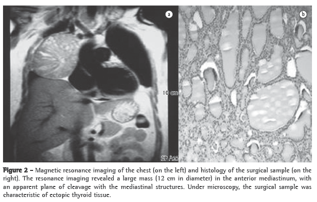 Regarding intrathoracic (mediastinal) location, we found only 7 cases in the literature. In 5 of those cases, the ectopia was located in the anterior mediastinum,(8,11-13) as in the cases reported here, and, in 2,(12,14) it was located posteriorly. Therefore, although entirely intrathoracic ectopic goiters are rare, they have to be considered in the differential diagnosis of all mediastinal masses.(15)