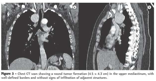 A CT scan of the chest revealed, in the upper mediastinum, a round, extensive formation (4.5 × 4.3 cm), without signs of infiltration and with well-defined borders, located laterally between the superior vena cava and the right contour of the trachea (Figure 3).