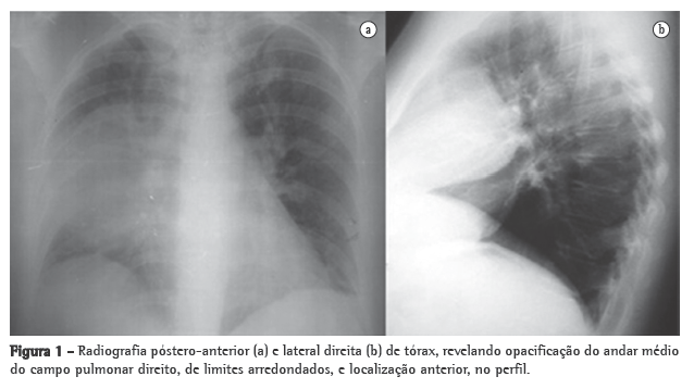 Apresentava também hipoxemia ao ar ambiente (PaO2: 79,5 mmHg) e ligeira hipocapnia (33 mmHg). A radiografia do tórax revelou uma opacidade no terço médio do campo pulmonar direito (Figura 1).