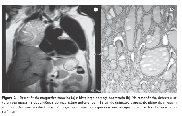 No que diz respeito à localização intratorácica (no mediastino), apenas encontramos 7 casos. Destes, 5 estavam localizados no mediastino anterior,(8,11-13) tal como neste relato e, em 2 casos,(12,14) a localização era posterior. Assim, os bócios ectópicos totalmente intratorácicos são raros,(11,12,15) mas têm que ser considerados no diagnóstico diferencial de todas as massas mediastínicas.(15)