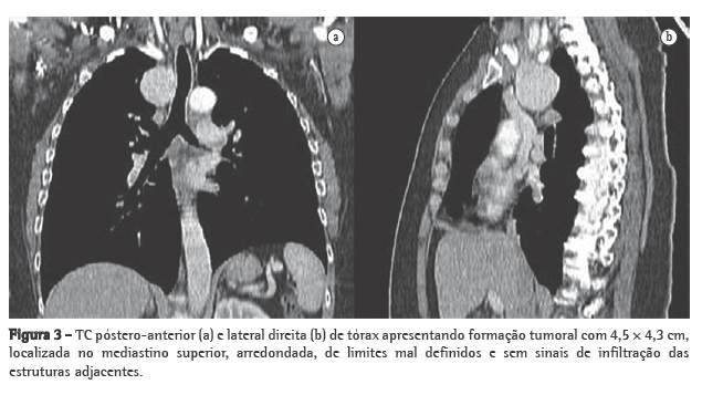 A TC do tórax evidenciava, no mediastino superior, em localização lateral direita entre a veia cava superior e o contorno direito da traqueia, uma formação arredondada, expansiva, sem sinais infiltrativos, com 4,5 × 4,3 cm e contornos mal definidos (Figura 3).
