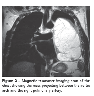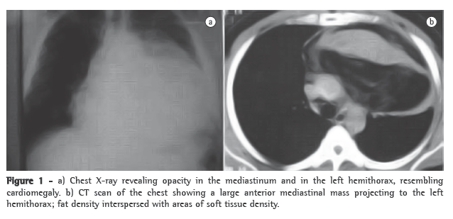 Characteristic CT findings involve fatty tissue containing soft tissue streaks that probably represent islands of normal thymic components.(11) Fat density on CT scans, however, can also indicate lipoma, liposarcoma, teratoma, prominent epicardial fat pad or congenital diaphragmatic hernias.(1) In general, MRI scans show areas of high signal intensity intermingled with areas of intermediate intensity on T2-weighted images, and the adipose tissue of the tumor appears isointense in T1-weighted images.(12) Although the diagnosis is strongly suggested by imaging studies that demonstrate fat and soft tissue within the tumor without the invasion of neighboring structures, it is not possible to make an exact diagnosis or even to differentiate benign from malignant neoplasms.(13,14) Although biopsy can be technically feasible, it is not indicated in these cases, because the mass must be surgically addressed and, if possible, completely excised.