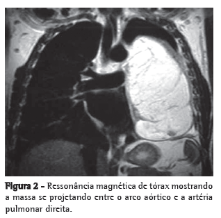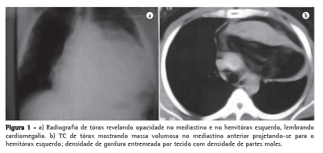 Uma radiografia de tórax ântero-posterior revelou uma opacidade ocupando o mediastino e o hemitórax esquerdo (Figura 1). Uma TC de tórax revelou uma volumosa massa ocupando o mediastino ântero-superior e estendendo-se até o hemitórax esquerdo, do diafragma ao ápice, deslocando o pulmão posteriormente (22 × 19× 17 cm). A massa era constituída de áreas de densidade de gordura entremeadas por tecido com densidade de partes moles, causando colabamento pulmonar e discreta compressão cardíaca (Figura 1). A massa revestia o coração e os grandes vasos, especialmente em volta da veia braquiocefálica esquerda e da aorta ascendente. A ressonância magnética (RM) mostrou espirais de alta intensidade de sinal intercaladas por áreas de intensidade intermediária em T2 (Figura 2), bem como uma projeção da massa entre o arco aórtico e o tronco pulmonar. Não havia plano claro entre o arco aórtico, a veia braquiocefálica esquerda e o tumor, mas não havia invasão dessas estruturas na RM.