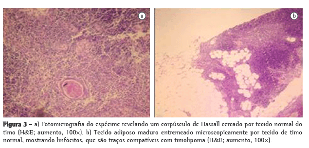 Ao exame macroscópico, o tumor ressecado estava encapsulado por uma superfície elástica, suave e lisa, composta de tecido amarelado. O diagnóstico histopatológico revelou um timolipoma benigno que consistia de tecido gorduroso maduro e estruturas tímicas hiperplasiadas com corpúsculos de Hassall (Figura 3).