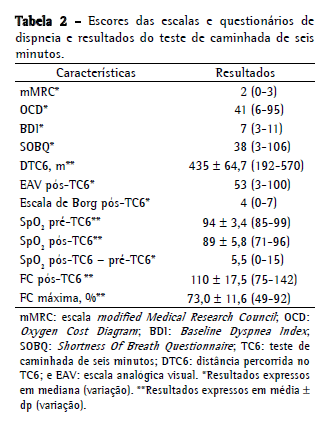 As medidas das escalas e questionários de dispneia aplicados, assim como aquelas derivadas do TC6, é mostrada na Tabela 2. A média da DTC6 foi maior nos homens que nas mulheres (447 ± 67 m vs. 408 ± 51 m; t = 2,03, p = 0,048).