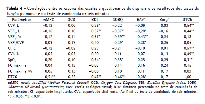 Os coeficientes de correlação (rs) entre as diversas medidas de dispneia variaram de 0,31 a 0,79, com todas as correlações na direção esperada. A correlação mais forte foi observada entre a escala de Borg e EAV ao final do TC6 (rs = 0,79). Uma elevada correlação foi também observada entre BDI e SOBQ (rs = −0,73). Correlações menores, mas significativas, foram observadas entre as outras escalas de dispneia.