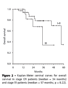 This was a retrospective descriptive study. A list of patients was obtained from the records of the Hospital Information System of INCA Unit I. The medical charts of those patients were reviewed for the collection of information, which was recorded on a standard form. Data collection was performed at INCA Unit I. Among the baseline characteristics assessed were age, performance status, smoking, comorbidities, initial disease stage, date of diagnosis, and current disease status. Regarding adjuvant therapy, the number of courses used was assessed, as were the dates of the courses, the date of recurrence after treatment, and the date of death or the date of the last visit to the facility. The data on the forms were entered into an electronic spreadsheet (Microsoft Excel 97) for subsequent analysis. The study was approved by the INCA Research Ethics Committee.