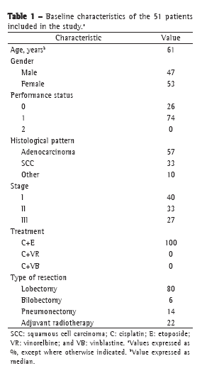 We included 51 patients. The median age was 61 years (range, 40-76 years). Of those 51 patients, 27 (53%) were female and 24 (47%) were male. Forty-six patients (90%) were smokers or former smokers. The most common histological type was adenocarcinoma (in 57% of the cases), followed by squamous cell carcinoma (in 33%). In 40%, 32%, and 27% of the patients, respectively, the disease was in stage I, II, or III. Lobectomy was the predominant surgical procedure employed, being performed in 40 patients (80%). Only 7 patients (14%) underwent pneumonectomy, whereas 4 (6%) underwent bilobectomy. Adjuvant chemotherapy consisted of cisplatin plus etoposide in all cases, with a median of 4 courses (range: 1-4). Although the initial cisplatin dose was 80 mg/m2 in 30 patients (59%), 41 (80%) received at least 75 mg/m2 as the initial dose. Thirty-nine patients (76%) received an initial etoposide dose of 300 mg/m2, and 11 patients (22%), of whom 5 had stage I or II disease and 6 had stage III disease, also received adjuvant radiotherapy after chemotherapy. The baseline characteristics are summarized in Table 1.