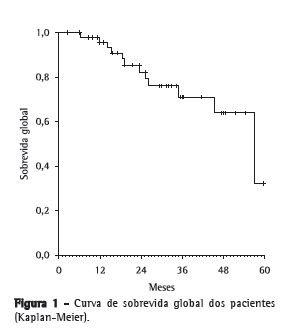 As análises estatísticas foram realizadas com o auxílio do pacote estatístico Statistical Package for the Social Sciences, versão 13.0 (SPSS Inc., Chicago, IL, EUA). A sobrevida global e a sobrevida livre de doença foram determinadas através da construção de curvas pelo método de Kaplan-Meier, enquanto o teste de log-rank foi utilizado para a análise das variáveis. A sobrevida global foi definida como o intervalo de tempo entre o primeiro dia do primeiro ciclo de quimioterapia adjuvante até a data do óbito ou até a data da última visita ao hospital (serviço de emergência ou visita ambulatorial). A sobrevida livre de doença foi definida como o intervalo de tempo entre o início do tratamento quimioterápico adjuvante e a documentação de recidiva da doença, de morte ou de interrupção do seguimento.