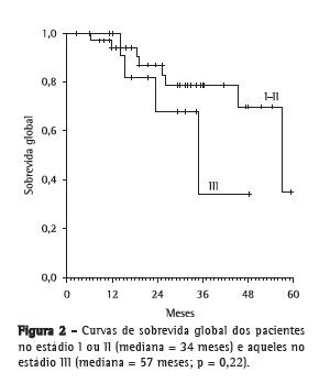 A mediana do tempo de seguimento foi de 31 meses (IC95%: 28,4-34,1), e a mediana de sobrevida global foi de 57 meses (IC95%: 40,4-73,5; Figura 1). O percentual de pacientes vivos em 12, 36 e 60 meses, respectivamente, foi de 95%, 70% e 31%. Na análise das variáveis, houve uma tendência a menor sobrevida entre os pacientes em estádio avançado (Figura 2), sendo a mediana de sobrevida de 34 meses (IC95%: 18,2-51,4) para os pacientes no estádio III, em contraste à mediana de sobrevida de 57 meses (IC95%: 40,4-73,5) para aqueles nos estádios I ou II (p = 0,22). Após o uso de radioterapia adjuvante, a mediana da sobrevida foi de 19 meses, enquanto os pacientes não tratados com radioterapia tiveram uma mediana de sobrevida de 57 meses (p < 0,001). Não houve diferenças na sobrevida global em relação ao gênero (p = 0,70), padrão histológico (p = 0,33) ou dose de cisplatina (p = 0,13).