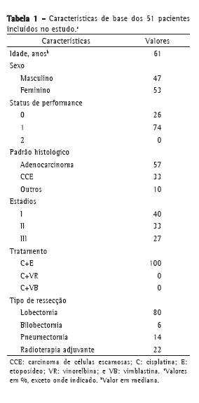 Apenas 7 pacientes (14%) foram submetidos a pneumectomia, ao passo que 4 (6%) foram submetidos a bilobectomia. A quimioterapia adjuvante consistiu em cisplatina mais etoposídeo em todos os casos, com mediana de 4 ciclos (variação: 1-4). A dose inicial de cisplatina foi de 80 mg/m2 em 30 pacientes (59%), mas 41 (80%) receberam pelo menos 75 mg/m2 como dose inicial. Do total da amostra, 39 pacientes (76%) receberam dose inicial de etoposídeo de 300 mg/m2, e 11 pacientes (22%) também receberam radioterapia adjuvante após a quimioterapia, sendo 5 pacientes nos estádios I ou II e 6 pacientes no estádio III. As características de base estão resumidas na Tabela 1.