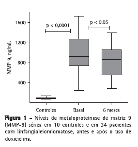 redução nos títulos séricos e urinários de MMP-9, assim como nos níveis séricos de MMP-2, nas pacientes com LAM. O bloqueio de MMP-9 sérica evidenciado em nosso estudo foi limítrofe (p = 0,05), sugerindo que o uso de doxiciclina por um tempo mais prolongado possa intensificar esse bloqueio. No caso da MMP-2, a redução evidenciada nos níveis séricos foi estatisticamente significante. Houve decréscimo nos títulos da MMP-9 urinária, sendo esse bloqueio igualmente limítrofe (p = 0,10).