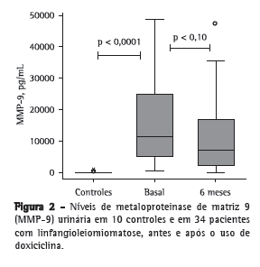 Os títulos de MMP-2 sérica apresentaram uma mediana basal abaixo do nível de detecção (percentil 75: 833 pg/mL) e uma mediana após o tratamento com doxiciclina também abaixo do limite de detecção (percentil 75: 592 pg/mL; p = 0,04). Houve decréscimo nos títulos em 11 pacientes (32%), apresentando uma variação da mediana de −12% (II: −75% a −12%), e, nas 23 pacientes restantes, houve estabilização ou incremento, com mediana e II abaixo do limite de detecção. Todos os níveis de MMP-2 urinária estavam abaixo do limite de detecção.