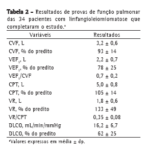 Ao final do estudo, 34 pacientes completaram seis meses de tratamento e realizaram as dosagens de MMP-2 e MMP-9 no sangue e na urina. As características clínico-funcionais desse grupo encontram-se nas Tabelas 1 e 2.