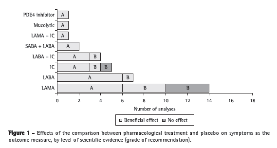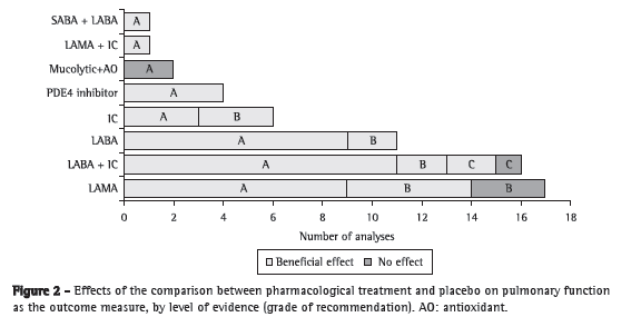 The selection of original studies and the determination of the levels of scientific evidence were the cornerstones of the present review. The efficacy/effectiveness of the medications in producing various outcomes was evaluated with the purpose of contributing to the continuing education of health professionals, as well as to the future development of consensuses, guidelines, and algorithms for the pharmacological treatment of patients with COPD. In view of the wide variety of treatments available for COPD, we limited our search to the pharmacological treatment of the disease. Treatment components, such as the use of oxygen therapy, ventilatory support, and antibiotic therapy during exacerbations, as well as the use of vaccines and specific treatment for the prevention of smoking-related COPD, were outside the scope of the present review.