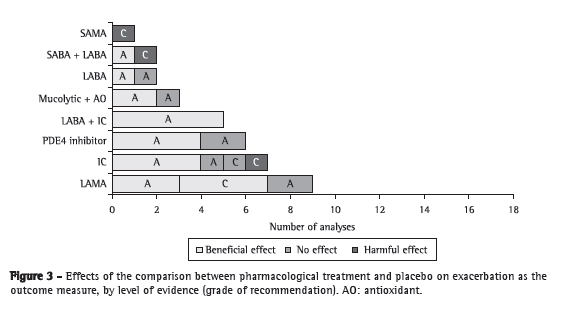 One of the principal objectives of COPD treatment is to prevent and treat COPD exacerbations, given that COPD exacerbations worsen the quality of life of patients, accelerate the progressive decline in pulmonary function, and increase mortality.(4,40) In the present review, 35 analyses compared the effect of the medications used in order to prevent COPD exacerbations with that of placebo (Figure 3). Most of the analyses of the effect of LAMAs-involving patients with moderate to severe COPD, as determined by the GOLD classification-have suggested that LAMAs reduce the number of exacerbations or increase the interval between episodes of exacerbation. Two groups of authors(41,42) found no beneficial effects, which might be due to the inclusion of patients with only one episode of exacerbation in the previous year or to greater losses to follow-up in the untreated group. Regarding the use of LABAs, Campbell et al.(27) found no differences between patients treated with formoterol and those treated with placebo in terms of the effect of the treatment on the number of exacerbations. However, Calverley et al.(43) reported that the number of exacerbations was lower in the individuals who were treated with salmeterol than in those who received placebo; it is of note that we found only 2 analyses of the use of salmeterol. Although the combination of LABAs and SABAs was not shown to reduce the number of exacerbations, patients who received the combination required rescue medications less frequently than did those who received placebo.(27) One study reported that neither SAMAs nor the SABA-LABA combination had a beneficial effect on the number of hospitalizations(44); however, that study received a grade C recommendation. Of the 7 analyses of the effect of ICs on COPD exacerbations, 4 found a reduction in the number of exacerbations in comparison with that seen in the placebo group. Choudhury et al.(45)reported an increase in the interval between exacerbations but observed no additional benefits. Macie et al.(44) found no differences between patients receiving ICs and those receiving placebo in terms of the number of hospitalizations (exacerbations) for cardiovascular disease, whereas Ernst et al.(46) showed that the risk of hospitalizations for pneumonia was higher in COPD patients receiving ICs. All of the analyses of the effect of the LABA-IC combination found that the number of exacerbations was lower in patients receiving the combination than in those receiving placebo. According to Rennard et al.,(47) the formoterol-budesonide combination increased the interval between exacerbations and reduced the number of exacerbations by approximately 40% in comparison with placebo. Most of the analyses of the effect of PDE4 inhibitors on the number of COPD exacerbations found that PDE4 inhibitors had a beneficial effect. In 2007, Calverley et al.(48) studied patients with severe or very severe COPD receiving PDE4 inhibitors or placebo and found no differences between PDE4 inhibitors and placebo in terms of their effect on the number of exacerbations. However, in 2009, the same group of authors(31) investigated a larger sample and found a 17% reduction in the annual rate of moderate to severe exacerbations per patient among patients receiving PDE4 inhibitors in comparison with that found among those receiving placebo, specifically in symptomatic cases. In addition, the authors noted longer intervals between exacerbations and less need for corticosteroid and antimicrobial use in order to treat COPD exacerbations. As can be seen in Figure 3, in 2 of the 3 analyses compared (all with a grade A recommendation), the use of mucolytics and antioxidants was shown to have a beneficial effect in terms of preventing exacerbations. Aaron et al.(33) conducted a study investigating the use of LAMAs in combination with other medications in patients with moderate or severe COPD, as determined by the GOLD classification. The authors noted that, among the patients receiving LAMAs in isolation, the proportion of patients who presented with exacerbations requiring the use of systemic corticosteroids or antimicrobials did not differ from that observed among those receiving the LAMA-LABA combination or the LAMA-LABA-IC combination. In contrast, the LAMA-LABA-IC combination reduced the rate of hospitalizations for COPD by nearly 40% in comparison with that observed for LAMAs in isolation. We found no studies comparing formoterol and salmeterol in terms of their effect on COPD exacerbations. Donohue et al.(16) found no significant differences between patients treated with formoterol and those treated with salmeterol regarding the number of exacerbations occurring in one year. In the analyses evaluated, the use of LABAs and ICs in combination was shown to be superior to that of LABAs or ICs in isolation for the following outcome measures(19-21,43,47): number of exacerbations; severe exacerbations requiring hospitalization; and use of systemic corticosteroids.